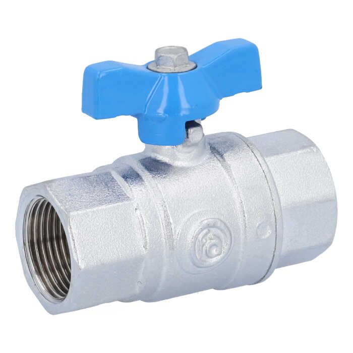 Kugelhahn 3/4", PN40, Ms/PTFE-FKM, Innengewinde, voller Durchgang, Flügelgriff blau