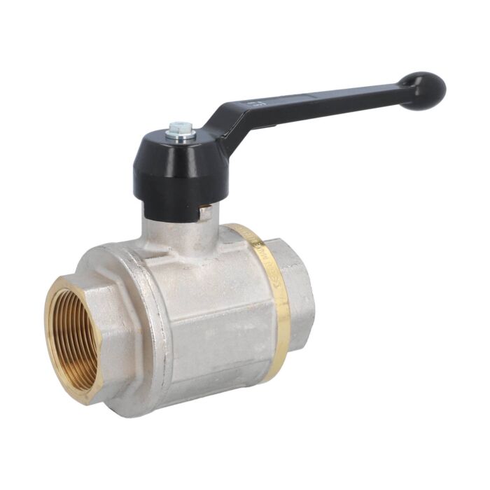 2-Wege Kugelhahn aus Messing mit Entleerungsbohrung für Druckluft auf der Gehäuseunterseite. Das Gehäuse besteht aus einer zweiteilig verschraubten Körperkonstruktion mit vollem zylindrischem Durchgang und beidseitigem Innengewinde. Der Handhebel aus Aluminium ist schwarz lackiert.