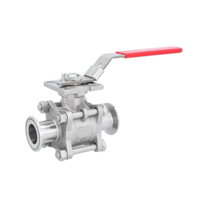 Kugelhahn DN32, PN63, 1.4408/PTFE-FKM, hohlraumarm Clamp nach DIN32676-Reihe A, ISO 5211, l=132mm