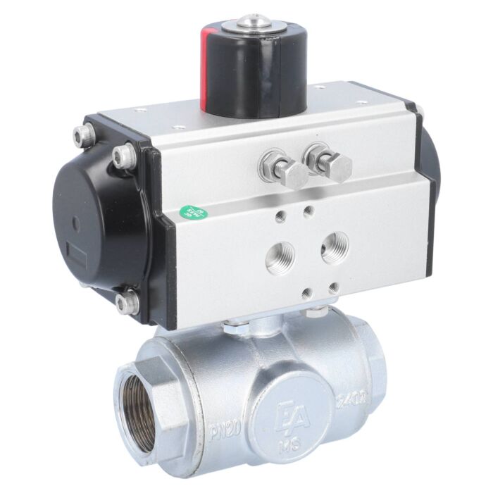 3-Wege Kugelhahn für neutrale gasförmige oder flüssige Medien. Direkt aufgebauter, pneumatischer Antrieb.