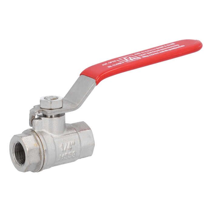 2-Wege Kugelhahn aus Messing zum Absperren von neutralen gasförmigen und flüssigen Medien. Das Gehäuse besteht aus einer zweiteilig verschraubten Körperkonstruktion mit vollem zylindrischem Durchgang und beidseitigem Innengewinde. Der Handhebel aus rostfreiem Edelstahl besitzt einen roten Kunststoffüberzug.