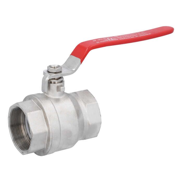 2-Wege Kugelhahn aus Messing zum Absperren von neutralen gasförmigen und flüssigen Medien. Das Gehäuse besteht aus einer zweiteilig verschraubten Körperkonstruktion mit vollem zylindrischem Durchgang und beidseitigem Innengewinde. Der Handhebel aus rostfreiem Edelstahl besitzt einen roten Kunststoffüberzug.