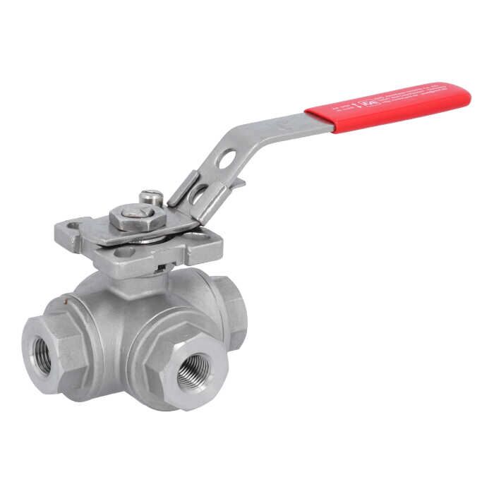 3-Wege Kugelhahn 1/4"-DIN2999, d9.5, PN63 T-Bohrung, Edelstahl 1.4408/PTFE-FKM, ISO5211