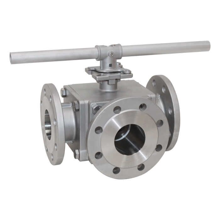 3-Wege Kugelhahn DN80, PN16, L-Bohrung Edelstahl 1.4408/PTFE/FKM, ISO5211