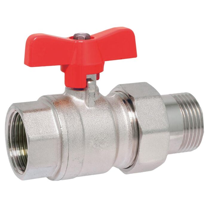 Kugelhahn 1/2", mit Verschraubung Ms/PTFE-NBR, voller Durchgang, Flügelgriff rot