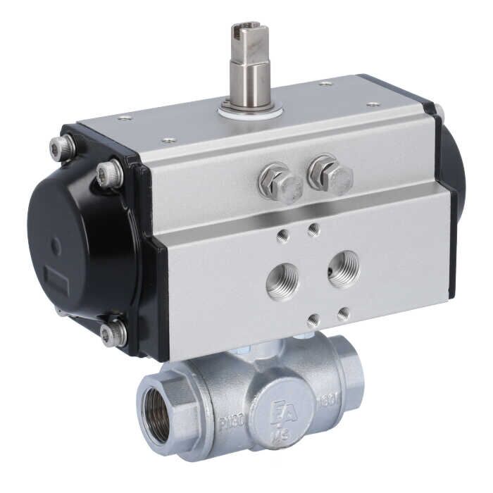 3-Wege-Kugelhahn, PN16, Antrieb OD, Ms/PTFE-FKM L-Bohrung, pneumatisch, doppeltwirkend / Artikelnummer: TN1114-OD