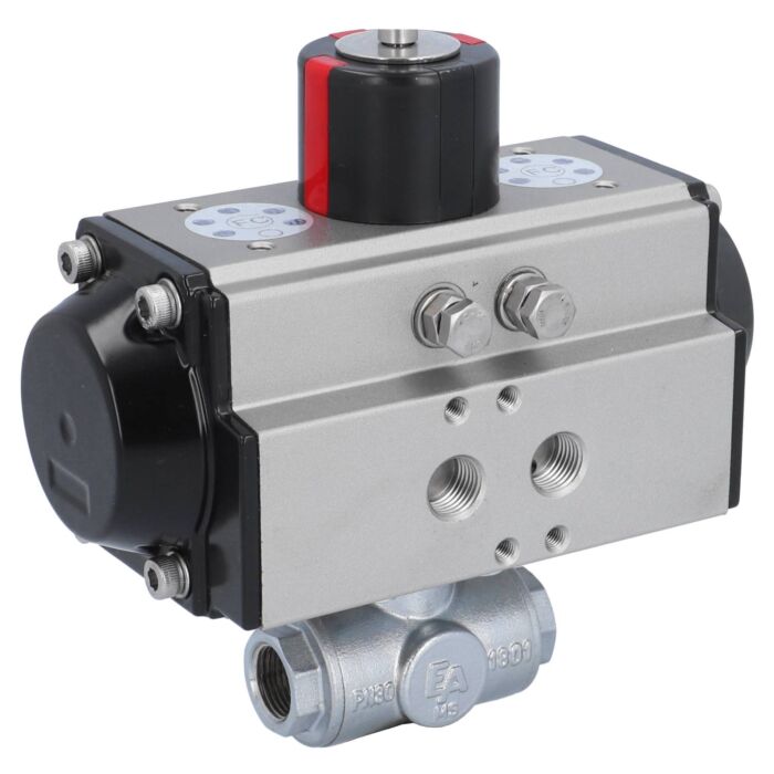 3-Wege-Kugelhahn, PN16, Antrieb OE, Ms/PTFE-FKM T-Bohrung, pneumatisch, federrückstellend / Artikelnummer: TN1115-OE