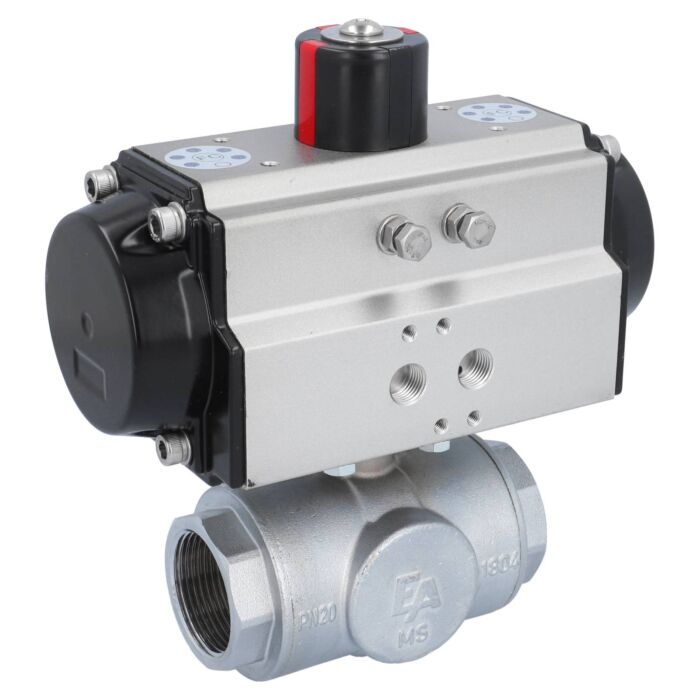 3-Wege-Kugelhahn, PN16, Antrieb OE, Ms/PTFE-FKM T-Bohrung, pneumatisch, federrückstellend / Artikelnummer: TN1115-OE
