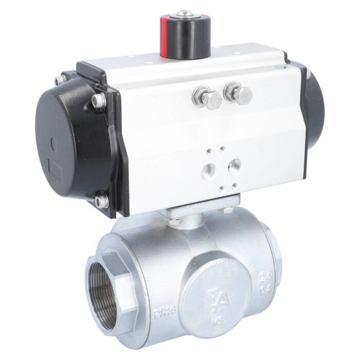 3-Wege-Kugelhahn, PN16, Antrieb OE, Ms/PTFE-FKM T-Bohrung, pneumatisch, federrückstellend / Artikelnummer: TN1115-OE