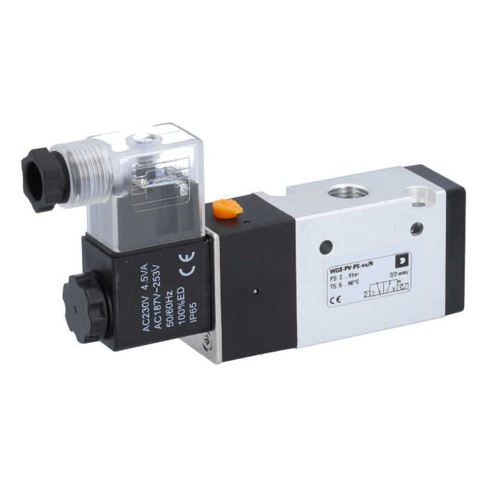 Bezeichnung 3/2-Wege Magnetventil 1/4", 230V 50/60Hz 2-10bar, mit Handnotbetätigung, Alu/NBR