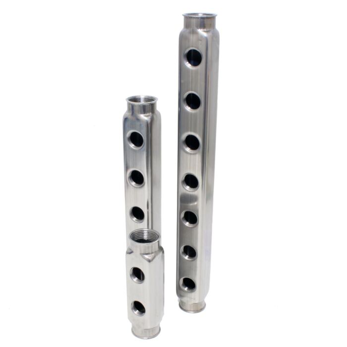 Bezeichnung Verteiler Edelstahl 1" - 7 Abgänge 1/2" Innen PN10, Achsabstand 50mm, max. Temp.: +100°C