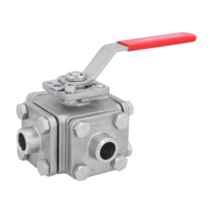 3-Wege Kugelhahn DN15, PN40, L-Bohrung Edelstahl 1.4408/PTFE/FKM, ISO5211, Anschweißende
