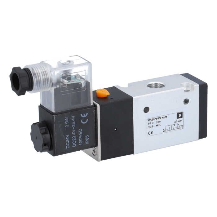 | Description | 3/2-Way Solenoid Valve 1/4", 24V DC 2-6bar, with manual override, Alu/NBR |