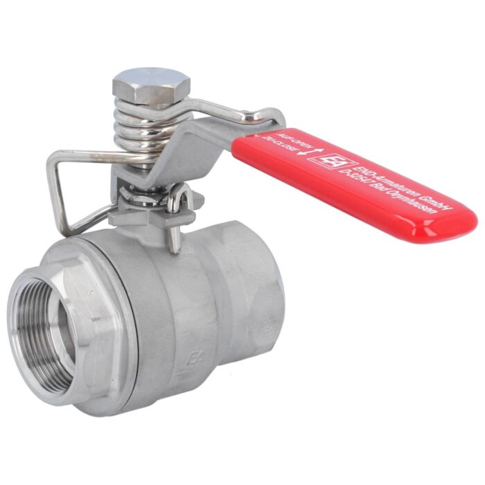 Kugelhahn 11/2", PN63, 1.4408/PTFE 2-teilig, Handhebel mit Federrückstellung